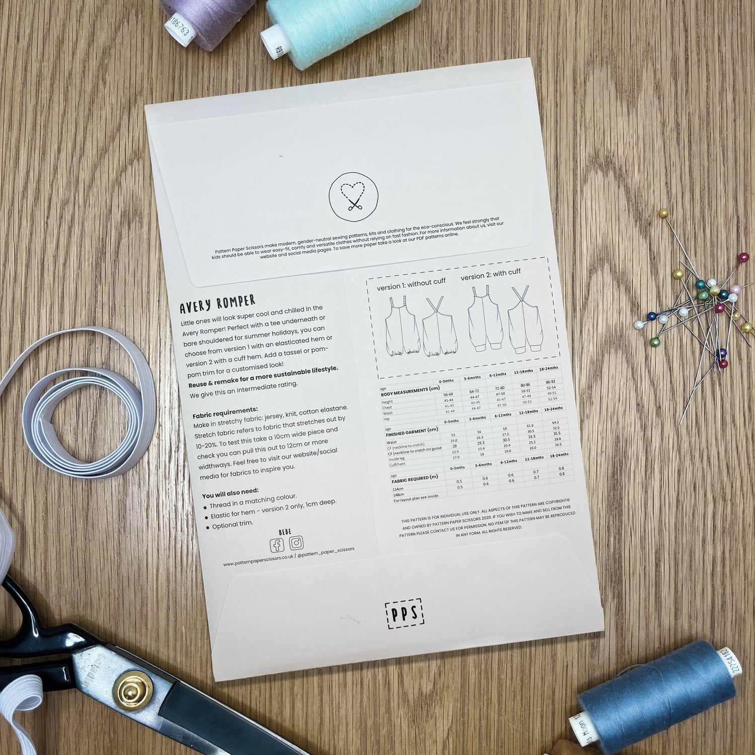 The Avery Romper sewing pattern (sizes 0–24 months) is the perfect mix of comfort and style for little ones.